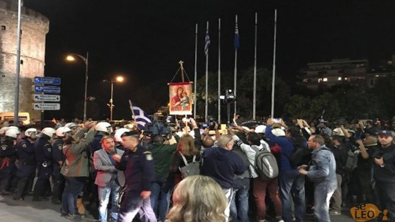 Μέλη του «Ιερού Λόχου» παλιοημερολογήτες μαζί με τον πατέρα Κλεομένη επιχείρησαν να μπουν στο θεάτρου φωνάζοντας συνθήματα όπως: «Σεβασμός στην Παναγία, πατρις θρησκεία ορθοδοξία».