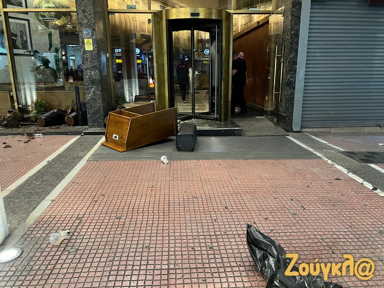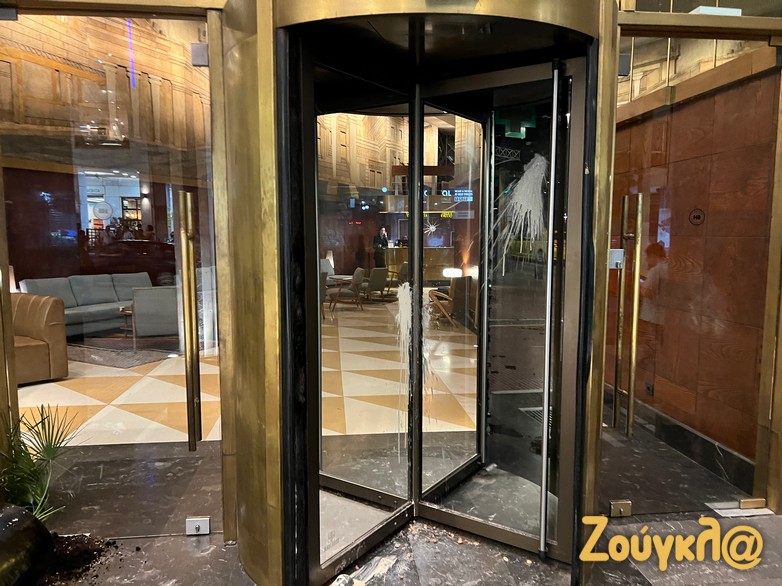 Εν τω μεταξύ σημαντικές υλικές ζημιές προκλήθηκαν σε γνωστό ξενοδοχείο στο κέντρο της Αθήνας κατά την αποχώρηση ορισμένων από τους διαδηλωτές, οι οποίοι πέταξαν πέτρες και άλλα αντικείμενα προκαλώντας καταστροφές στην πρόσοψή του. Aπόρρεια των επεισοδίων ήταν να γίνουν δύο προσαγωγές από τις αστυνομικές Αρχές, εκ των οποίων ο ένας σύμφωνα με πληροφορίες είναι ανήλικος Παλαιστίνιος.