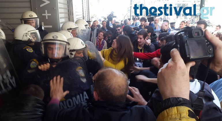 Οι διαδηλωτές θέλησαν να εισέλθουν εντός του κτηρίου, ωστόσο διμοιρία των ΜΑΤ, η οποία βρισκόταν στο σημείο τους εμπόδισε. Ακολούθησε ένταση και συγκρούσεις μεταξύ των αστυνομικών και των μελών του Συντονισμού.