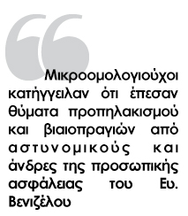 Η ηλεκτρονική μας εφημερίδα δέχθηκε το απόγευμα της Τετάρτης σωρεία τηλεφωνημάτων από μικροομολογιούχους, οι οποίοι κατήγγειλαν ότι έπεσαν θύματα προπηλακισμού και βιαιοπραγιών από αστυνομικούς και άνδρες της προσωπικής ασφάλειας του Ευάγγελου Βενιζέλου.