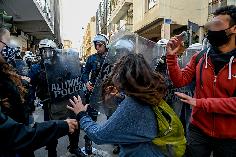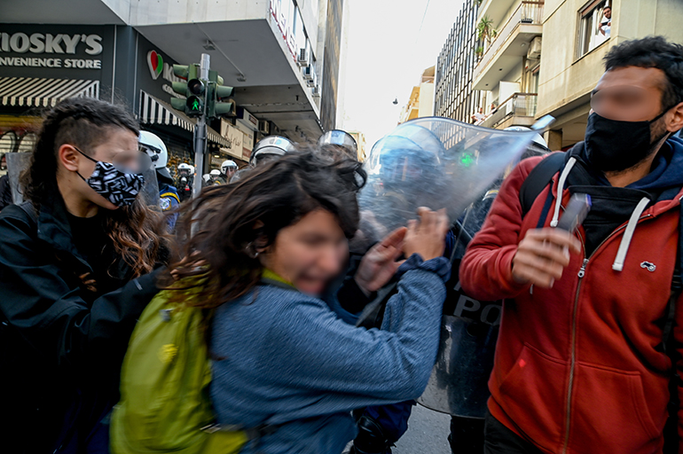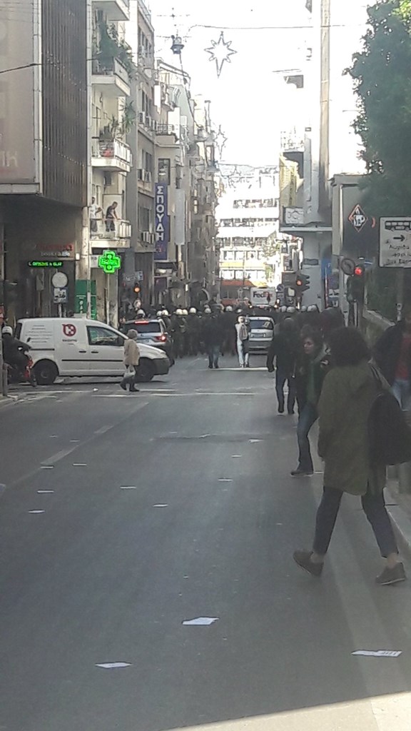 Σύμφωνα με πληροφορίες, περίπου 150 άτομα βρέθηκαν στα Προπύλαια για πορεία και στη συνέχεια ομάδα αγνώστων κατευθύνθηκε προς τα Εξάρχεια, οπού και επιτέθηκε με πυροσβεστήρες και καρέκλες κατά αστυνομικών δυνάμεων που φαίνεται να απάντησαν με χρήση χημικών.
