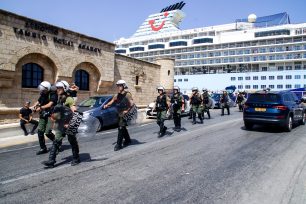 Από νωρίς, δρακόντεια μέτρα ασφαλείας είχαν τεθεί σε εφαρμογή στην ευρύτερη ζώνη του λιμανιού, με δύο διμοιρίες των ΜΑΤ να παρατάσσονται τόσο εντός όσο και εκτός του χώρου, προκειμένου να αποτραπούν τυχόν επαφές ή αψιμαχίες με τους αφιχθέντες τουρίστες.