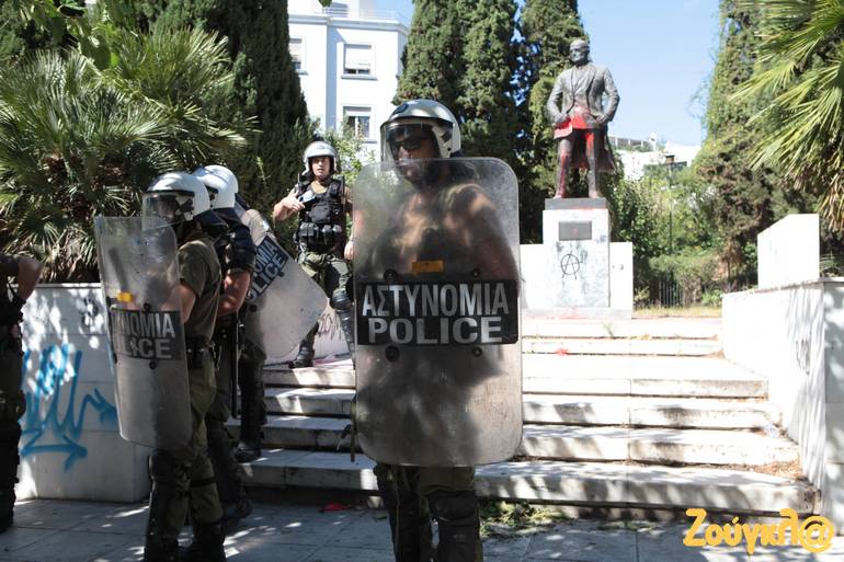 Συγκεκριμένα διαδηλωτές πέταξαν μπογιές στο άγαλμα του Τρούμαν, στην οδό Βασιλέως Κωνσταντίνου.