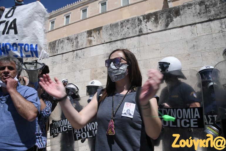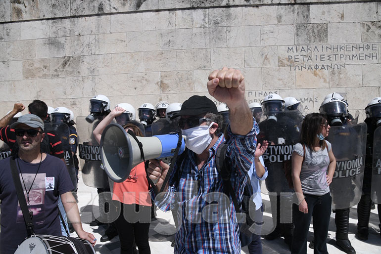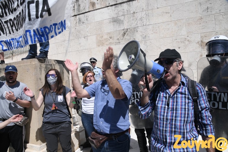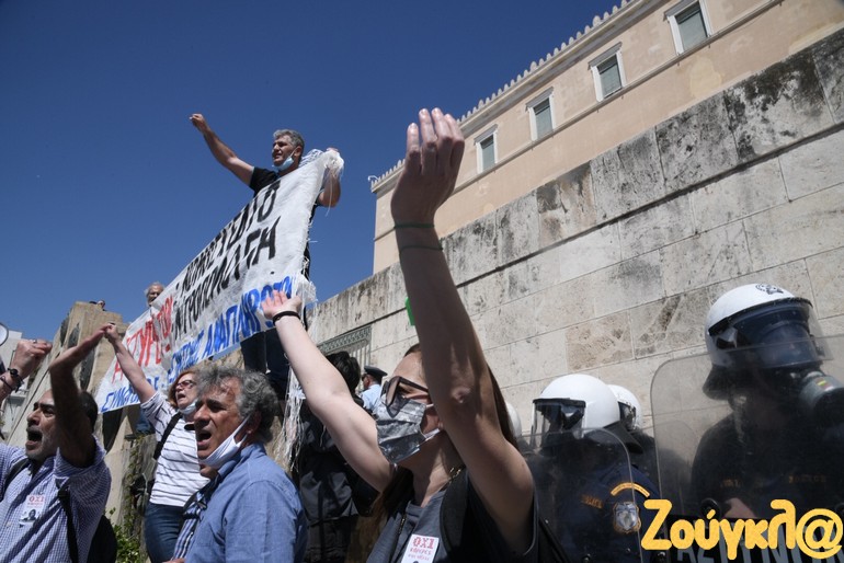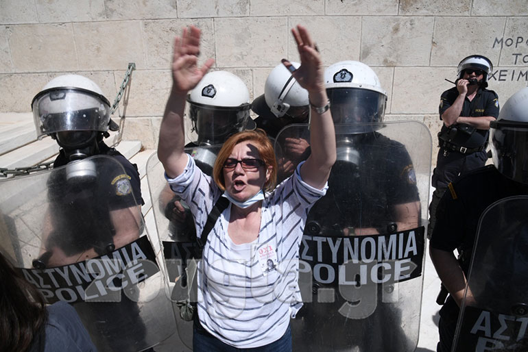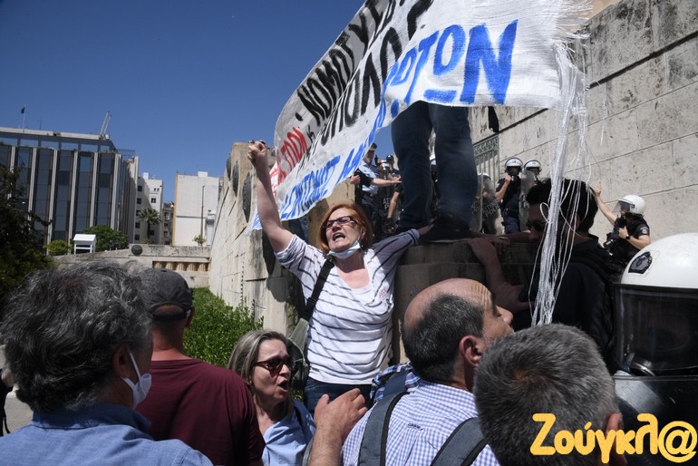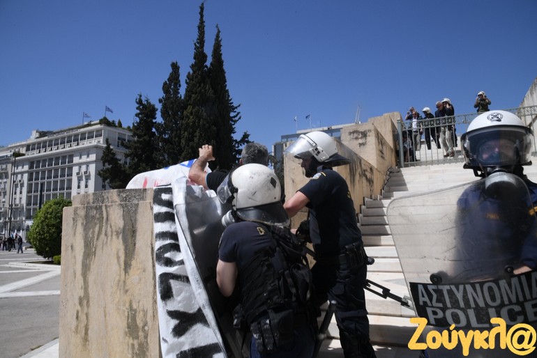 Ένταση επικράτησε στην Βουλή όταν διαδηλωτές προσπάθησαν να φθάσουν στα σκαλιά στον Άγνωστο Στρατιώτη για να αναρτήσουν πανό.