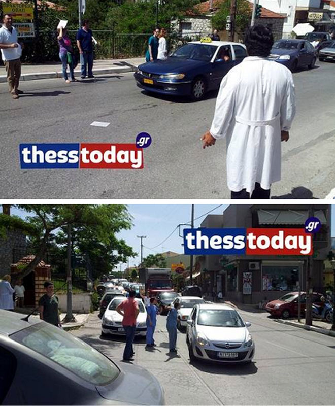 Εν τω μεταξύ, έξω από το νοσοκομείο Παπανικολάου, δημιουργήθηκε και κυκλοφοριακό πρόβλημα καθώς τα αυτοκίνητα που πήγαιναν για το νοσοκομείο και δεν μπορούσαν να μπουν λόγω της κινητοποίησης, προσπαθούσαν να κάνουν αναστροφή, όπου μπορούσαν. Οι γιατροί που ήταν στον δρόμο, επιχειρούσαν να τους ενημερώσουν και ελέγξουν αν σε κάποιο αυτοκίνητο υπήρχε κάποιο επείγον περιστατικό, ενώ ενημέρωναν ταυτόχρονα και τα διερχόμενα αυτοκίνητα για τους λόγους της κινητοποίησης τους.