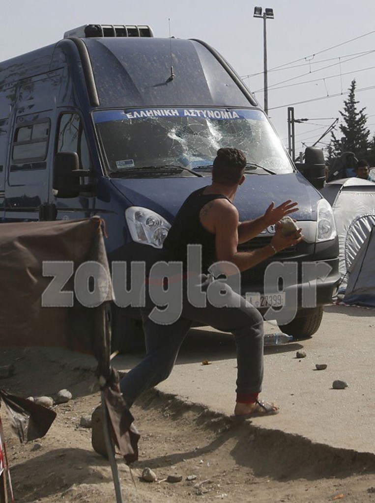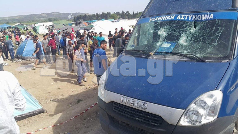 Ακολούθησε ένταση με τους πρόσφυγες να προκαλούν φθορές στο όχημα της ΕΛΑΣ με πέτρες και αιχμηρά αντικείμενα, ενώ αναποδογύρισαν και κάδους απορριμμάτων.