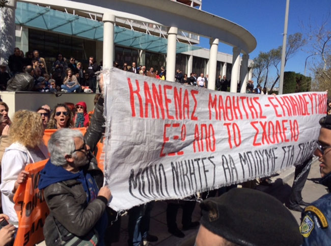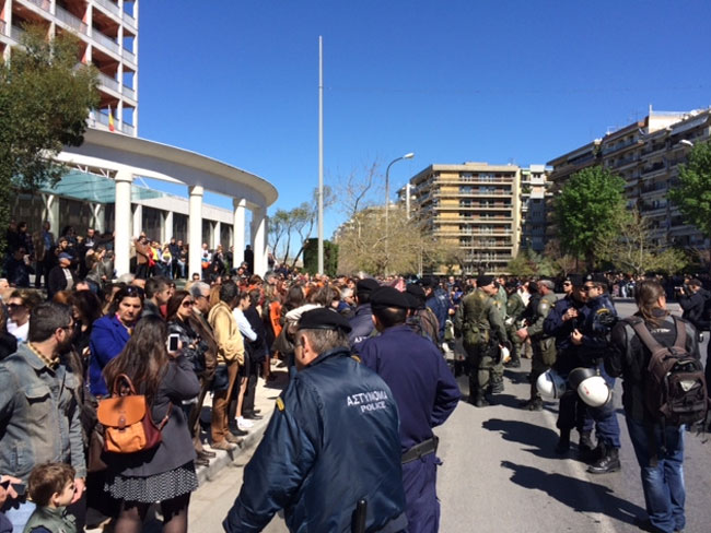 Συγκέντρωση διαμαρτυρίας ξεκίνησαν το πρωί εκπαιδευτικοί, μέλη των ΕΛΜΕ Θεσσαλονίκης, οι οποίοι αρχικά μαζεύτηκαν στον Λευκό Πύργο στη συνέχεια όμως προχώρησαν προς τον χώρο της παρέλασης.