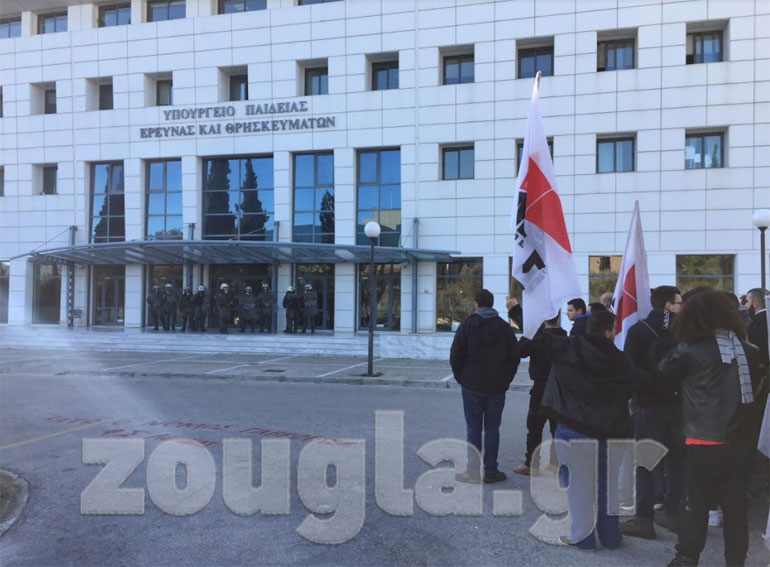 Σημειώνεται πως στην είσοδο του υπουργείου βρίσκονταν παρατεταγμένα τα ΜΑΤ.
