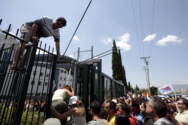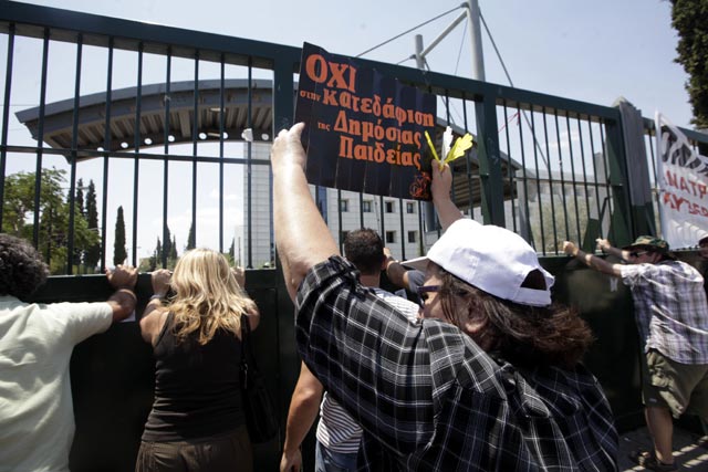 Οι καθηγητές, διαμαρτυρόμενοι έντονα για την ένταξή τους στο πρόγραμμα διαθεσιμότητας, εισέβαλλαν στο προαύλιο του κτηρίου στο Μαρούσι, με αποτέλεσμα να σπεύσουν στο σημείο αστυνομικές δυνάμεις και να κάνουν χρήση χημικών.