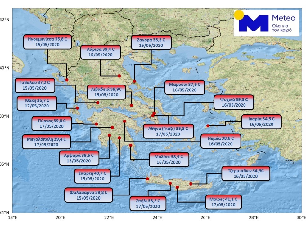Νέα ρεκόρ μέγιστων θερμοκρασιών για τον μήνα Μάιο καταγράφηκαν από το δίκτυο αυτόματων μετεωρολογικών σταθμών του Εθνικού Αστεροσκοπείου Αθηνών/meteo.gr, κατά το κύμα καύσωνα που επηρέασε τη χώρα μας το διάστημα 15-19/05/2020. Αξίζει να σημειωθεί ότι με βάση μια πρώτη ανάλυση, από τους 400 μετεωρολογικούς σταθμούς που απαριθμεί το δίκτυο, ρεκόρ σημειώθηκε τουλάχιστον στους μισούς. Ο ακριβής αριθμός θα δοθεί τις επόμενες ημέρες.