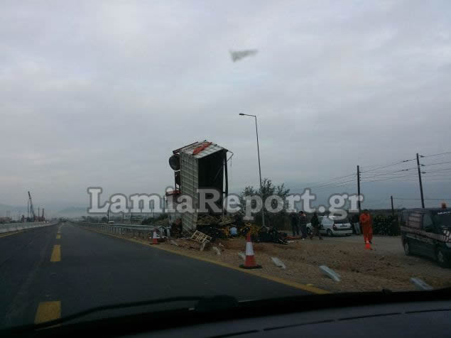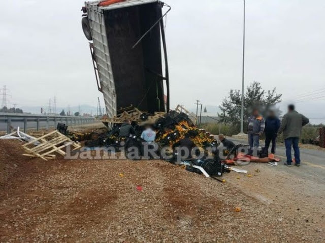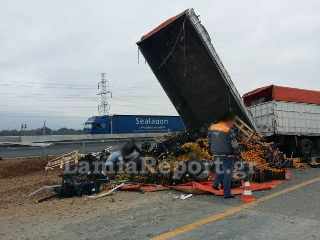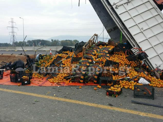 Οδηγός νταλίκας, για άγνωστη αιτία, έχασε τον έλεγχο από τη συρόμενη νταλίκα που μετέφερε πορτοκάλια, με αποτέλεσμα να σπάσει τις μπάρες να βγει εκτός οδοστρώματος και να καταλήξει στον παράδρομο όπως βλέπετε στις φωτογραφίες του LamiaReport….