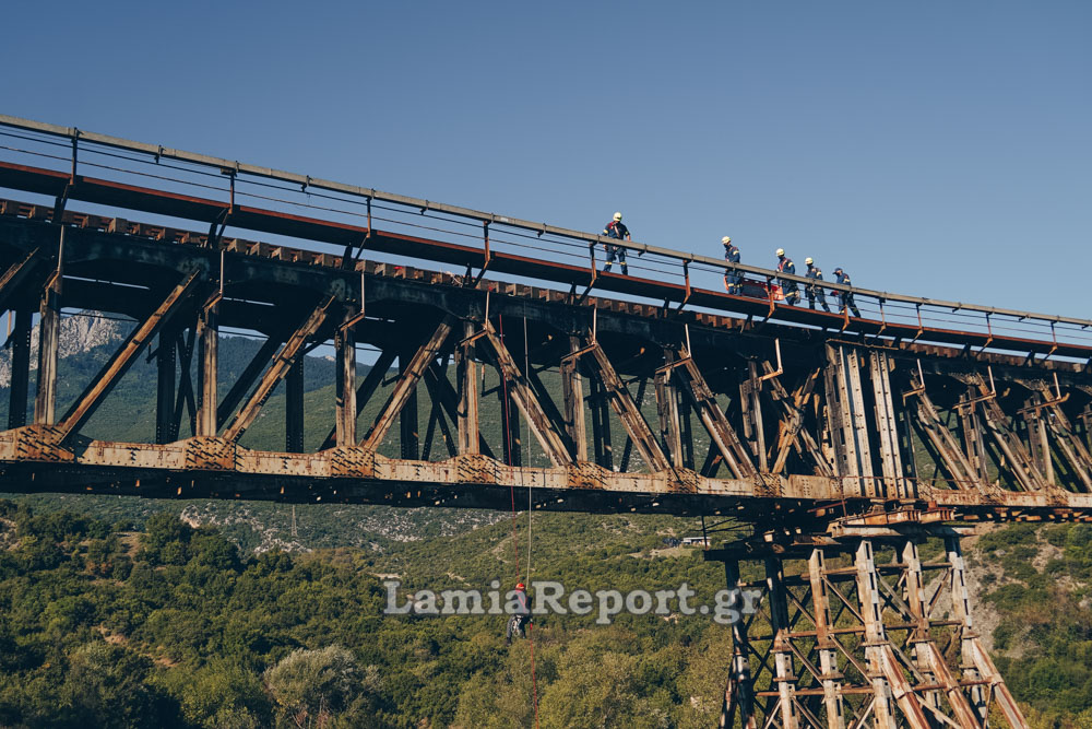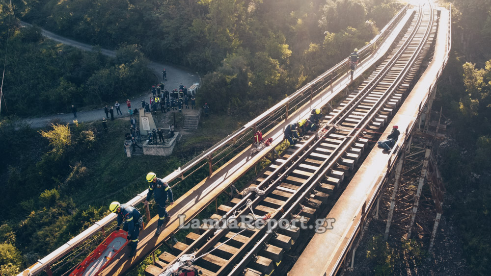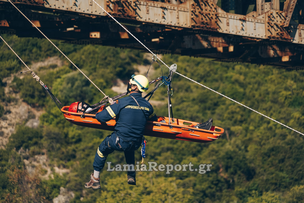 Το σενάριο της φετινής άσκησης, που παρουσιάζει την ετοιμότητα και τη σκληρή εκπαίδευση των στελεχών των Ειδικών Μονάδων Αντιμετώπισης Καταστροφών του Πυροσβεστικού Σώματος, εκτυλίχθηκε στην ιστορική γέφυρα του Γοργοποτάμου.