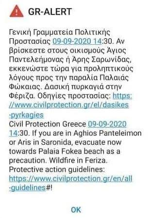 Στο ένα από τα δύο μηνύματα του 112 καλούνται επίσης να απομακρυνθούν προληπτικά οι κάτοικοι από τους οικισμούς Άγιος Παντελεήμονας και Άρης Σαρωνίδας και να κατευθυνθούν προς την παραλία της Παλαιάς Φώκαιας.