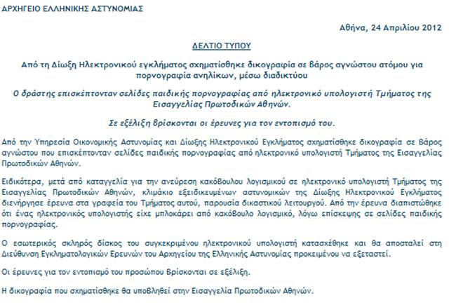 Την υπόθεση χειρίστηκε η Υποδιεύθυνση Δίωξης Ηλεκτρονικού Εγκλήματος. Η έρευνα επικεντρώθηκε στους υπαλλήλους στο τμήμα του «Ποινικού Μητρώου», όπου κατά την ανάλυση στα ψηφιακά ίχνη βρέθηκαν υπολογιστές μέσω των οποίων έχει γίνει «κατέβασμα» σκληρού πορνό.