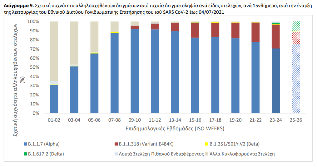 Εκ των 904 δειγμάτων με στελέχη ειδικού ενδιαφέροντος, τα 821 αφορούν στο στέλεχος Alpha, 14 αφορούν στο Βeta, 67 αφορούν στο Delta και 2 αφορούν στο Gamma.