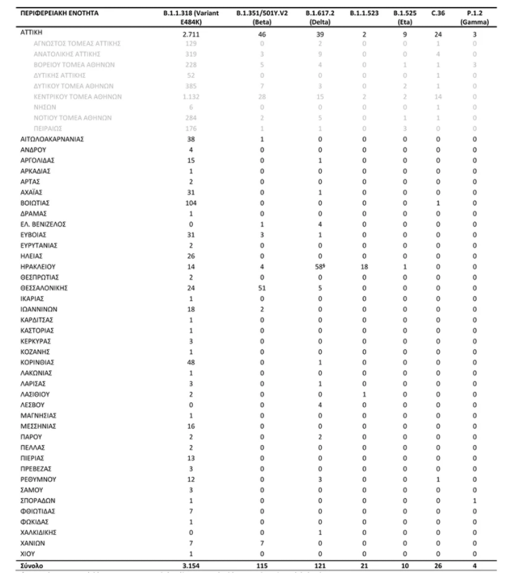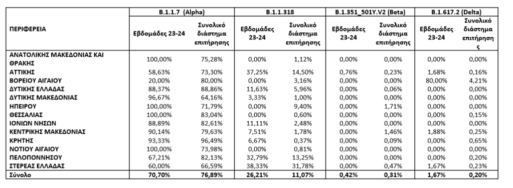 Από τα δείγματα αυτά, 21,38% αφορούν στο στέλεχος Alpha, 62,34% στο B.1.1.318 (Variant E484K), 3,35% στο Beta, 3,94% στο Delta και 0,27% στο C.36.