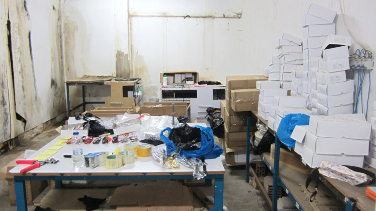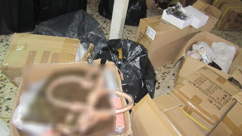 Κατά τη διάρκεια της έρευνας, εντοπίστηκε επιπλέον και υπόγειος χώρος στον οποίο βρίσκονταν επιμελώς συσκευασμένα σε κούτες, υποδήματα, τσάντες και ζώνες.