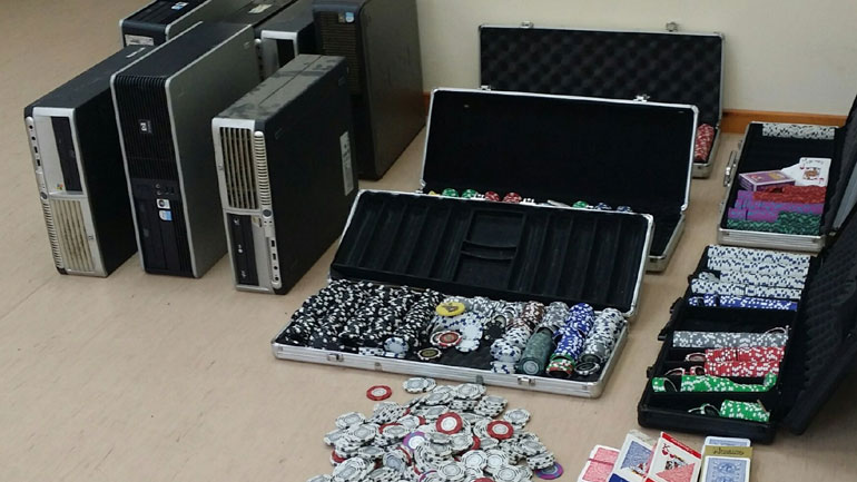 Συνολικά κατασχέθηκαν επτά εγκατεστημένοι υπολογιστές, το χρηματικό ποσό των 85 ευρώ και πέντε μεταλλικές βαλίτσες με μάρκες καζίνο και τράπουλες.