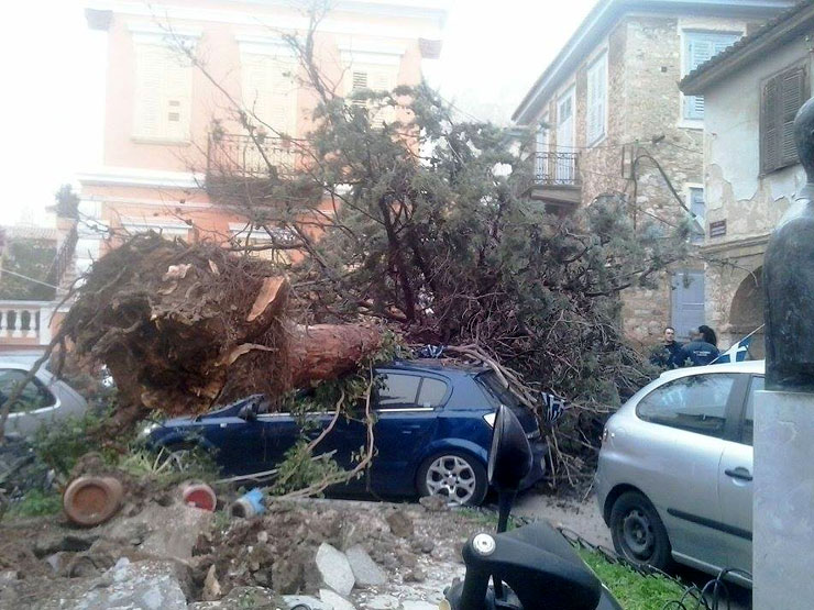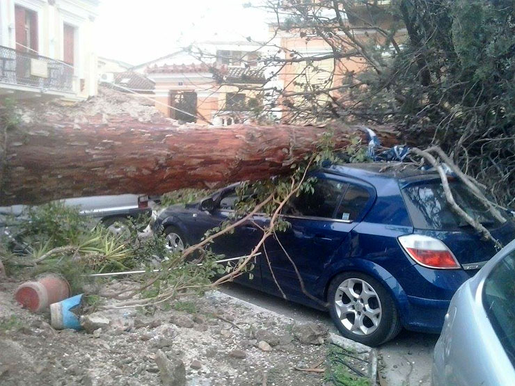 Σοβαρές υλικές ζημιές σε τέσσερα σταθμευμένα οχήματα προκάλεσε η πτώση ενός τεράστιου δέντρου στην πλατεία του Αγίου Σπυρίδωνα στην παλιά πόλη του Ναυπλίου.