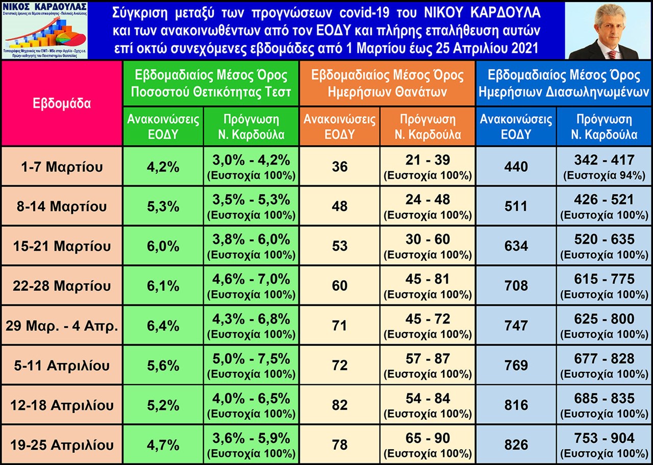 Στον παρακάτω πίνακα απεικονίζονται οι εβδομαδιαίες προγνώσεις για τους μέσους όρους του ποσοστού θετικότητας των τεστ, των θανάτων και των διασωληνωμένων ασθενών, για τις οκτώ εβδομάδες από τις 1 Μαρτίου έως τις 25 Απριλίου 2021, καθώς και οι ανάλογοι μέσοι όροι από τις ανακοινώσεις του ΕΟΔΥ.