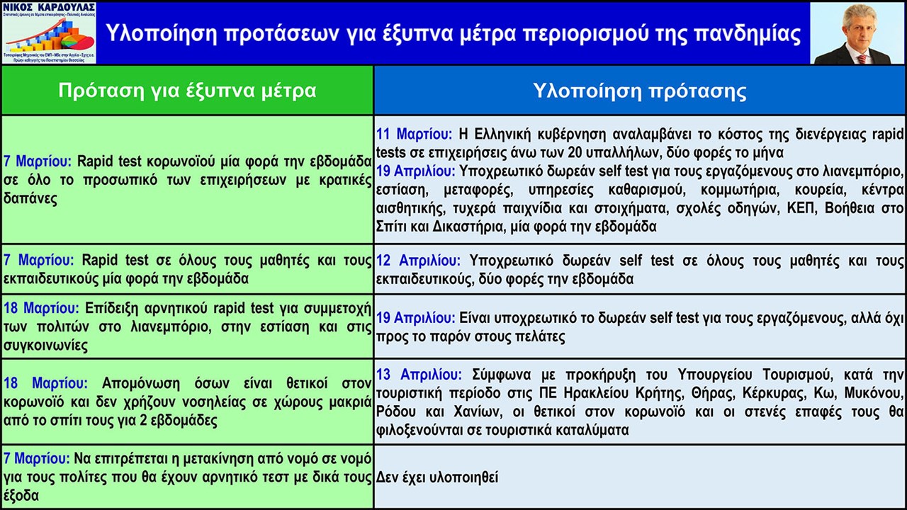Στις 7 και 18 Μαρτίου είχα προτείνει κάποια έξυπνα μέτρα για την αποσυμπίεση της πανδημίας και πριν ανακοινωθούν από την κυβέρνηση τα δωρεάν self tests. Οι προτάσεις των έξυπνων μέτρων, καθώς και η μέχρι τώρα υλοποίησή τους απεικονίζονται στον παρακάτω πίνακα: