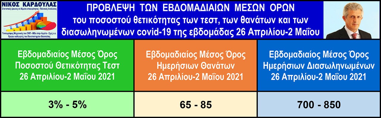 Με νέα προσομοίωση του μαθηματικού μοντέλου, έγιναν οι προγνώσεις για το ποσοστό θετικότητας των τεστ, τους θανάτους και τους διασωληνωμένους ασθενείς Covid-19 για την τρέχουσα Μεγάλη Εβδομάδα 26 Απριλίου έως 2 Μαΐου, οι οποίες δημοσιεύτηκαν στην προσωπική μου σελίδα του Facebook στις 26.04.2021 και όπου προβλέπεται μείωση των επιδημιολογικών δεδομένων σε σχέση με την περασμένη εβδομάδα και απεικονίζονται στον παρακάτω πίνακα: