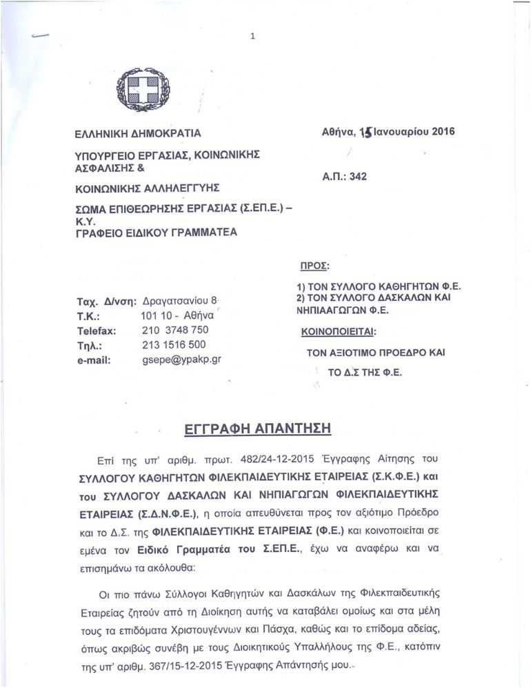 Αποδεχόμενος την επίκληση του Συντάγματος, αλλά και το γεγονός ότι οι ιδιωτικοί εκπαιδευτικοί συνάπτουν ατομικές συμβάσεις ιδιωτικού δικαίου, ο Ειδικός Γραμματέας του Υπουργείου Εργασίας με το έγγραφό του θεωρεί πως πρέπει να καταβληθεί και πάλι ο 13ος και 14ος μισθός στους ιδιωτικούς εκπαιδευτικούς της Φιλεκπαιδευτικής Εταιρείας.