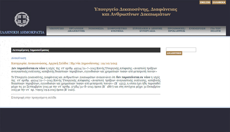 «Το Υπουργείο Δικαιοσύνης, Διαφάνειας και Ανθρωπίνων Δικαιωμάτων ανακοινώνει ότι δεν παρατείνεται εκ νέου η ισχύς της υπ’ αριθμ. 49214/21−7−2015 Κοινής Υπουργικής Απόφασης «Αναστολή πράξεων αναγκαστικής εκτέλεσης, καταβολής δικαστικών παραβόλων, εγγυοδοσιών και χρηματικών ποσών από μετατροπή ποινών» (Β΄ 1525), η οποία έχει ήδη παραταθεί μέχρι τις 30 Σεπτεμβρίου 2015 με την υπ’ αριθμ. 57384/31−8−2015 όμοια (Β΄ 1867) και στη συνέχεια μέχρι 31 Οκτωβρίου 2015 με την υπ΄ αρ. 70905/29.9.2015 όμοια (Β’ 2110)».