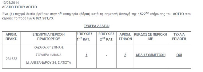 Την εύνοια της τύχης με το μέρος του είχε ένας παίκτης του Λόττο στην Σιάτιστα της Κοζάνης, ο οποίος έπαιξε σε τοπικό πρακτορείο του ΟΠΑΠ ένα δελτίο με έξι αριθμούς του Λόττο και κέρδισε ούτε λίγο ούτε πολύ 921.981,73 ευρώ.