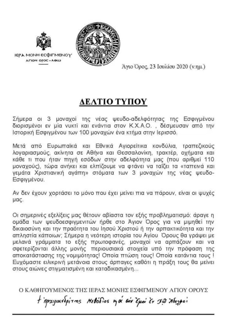 Λίγο αργότερα, οι ζηλωτές που βρίσκονται στη Μονή Εσφιγμένου εξέδωσαν και νέα ενημέρωση, η οποία αναφέρει τα εξής: