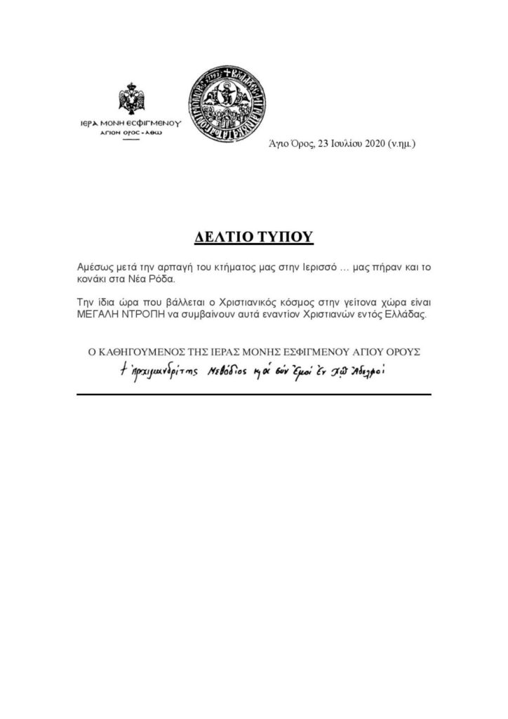 “Σήμερα 10/23.7.2020 παρελήφθησαν το αγρόκτημα της Μονής μεταξύ Ιερισσού και Στρατωνίου και το κονάκι της στα Νέα Ρόδα στις παρυφές του Αγίου Όρους.
