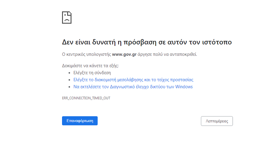 «Έπεσε» η κυβερνητική ιστοσελίδα gov.gr το απόγευμα της Κυριακής, λίγο μετά από την ανακοίνωση του πρωθυπουργού για καθολική απαγόρευση κυκλοφορίας στη χώρα μας και παράλληλα με τις υπουργικές ανακοινώσεις για την απαγόρευση στο Κέντρο Επιχειρήσεων Πολιτικής Προστασίας. Η ιστοσελίδα gov.gr πρόκειται να παρέχει πληροφορίες σχετικά με τους νέους περιορισμούς που επιβάλλονται από την κυβέρνηση, ενώ η φόρμα δήλωσης μετακίνησης θα βρίσκεται στο forma.gov.gr που αναμένεται να ανοίξει σήμερα το βράδυ.