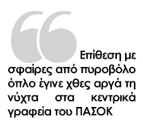 Επίθεση με σφαίρες από βαρύ πυροβόλο όπλο σημειώθηκε χθες αργά τη νύχτα στα κεντρικά γραφεία του ΠΑΣΟΚ επί της Χαριλάου Τρικούπη.