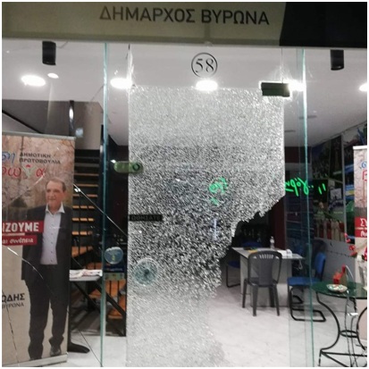 Επίθεση στα εκλογικά κέντρα τριών υποψηφίων Δημάρχων του Βύρωνα – που βρίσκονται στην οδό Χρυσοστόμου Σμύρνης – εξαπέλυσαν άγνωστοι τα ξημερώματα της Δευτέρας 29 Απριλίου, προκαλώντας σοβαρές υλικές ζημιές.