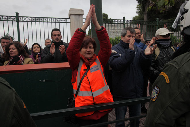 Η λεωφόρος Βασιλίσσης Σοφίας δόθηκε στην κυκλοφορία, ενώ στο πεζοδρόμιο απέναντι από το υπουργείο Διοικητικής Μεταρρύθμισης παραμένουν εκπρόσωποι σχολικών φυλάκων καθώς και αστυνομικές δυνάμεις.