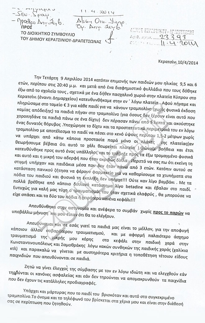 Ιδιαίτερο ενδιαφέρον παρουσιάζει μια καταγγελία που έφτασε στο Δ.Σ. του παραπάνω Δήμου στις 10 Απριλίου, η οποία προέρχεται από μία γυναίκα της οποίας το παιδί παραλίγο να τραυματιστεί σοβαρά στην πλατεία Κύπρου.