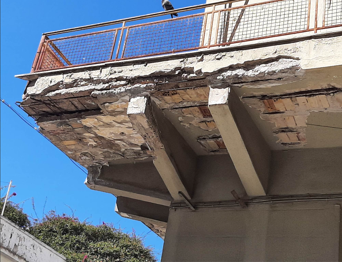 Οι πτώσεις σοβάδων και κομματιών τσιμέντου, από το κάτω μέρος του μπαλκονιού είναι συνεχείς και φυσικά ο κίνδυνος κατάρρευσης του ανά πάσα στιγμή είναι επίφοβος.