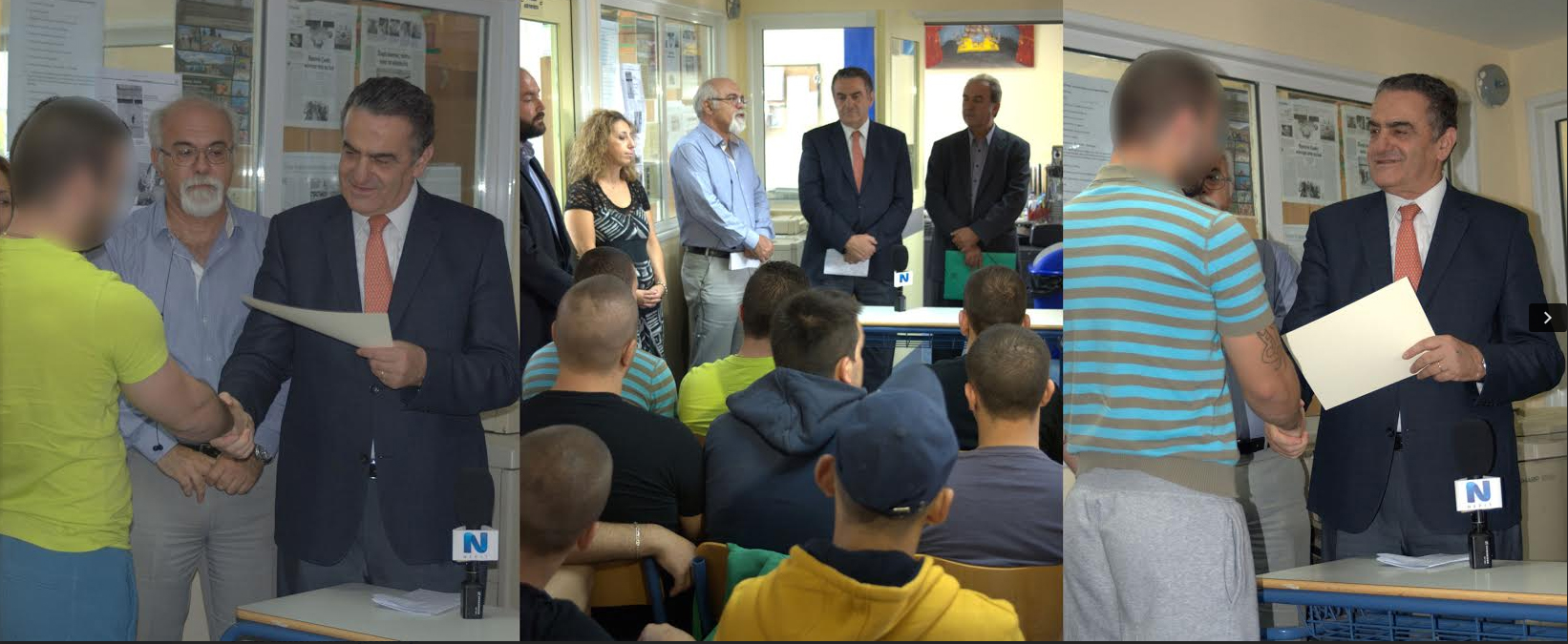 Ο Υπουργός Δικαιοσύνης, Διαφάνειας και Ανθρωπίνων Δικαιωμάτων κ. Χαράλαμπος Αθανασίου επισκέφθηκε την Τρίτη 23 Σεπτεμβρίου το Ειδικό Κατάστημα Κράτησης Νέων Αυλώνα προκειμένου να απονείμει επαίνους και χρηματικά έπαθλα των 500 ευρώ στους τέσσερις επιτυχόντες μαθητές του Λυκείου σε Ανώτατα Τεχνολογικά Εκπαιδευτικά Ιδρύματα της χώρας.