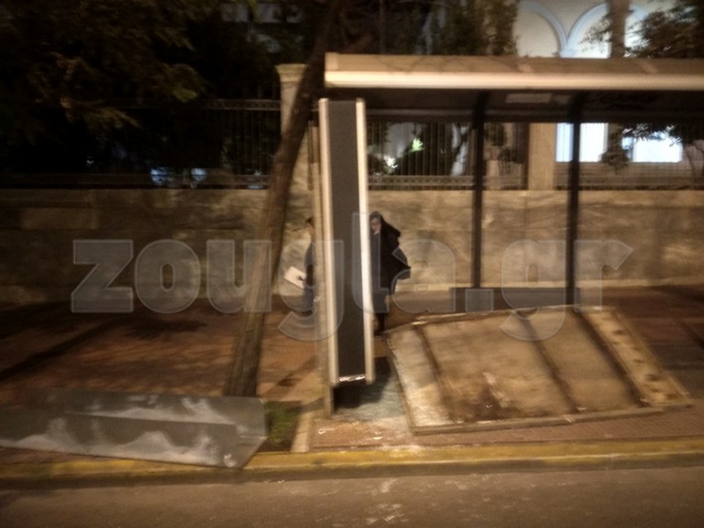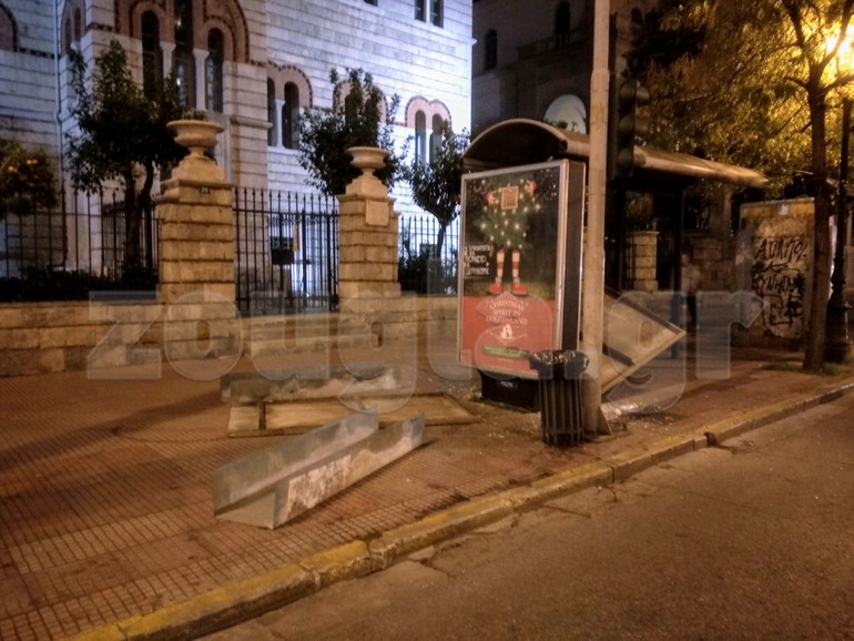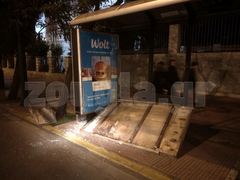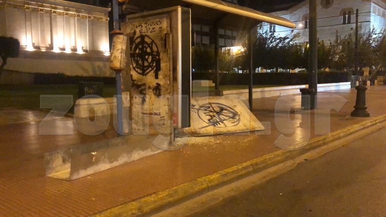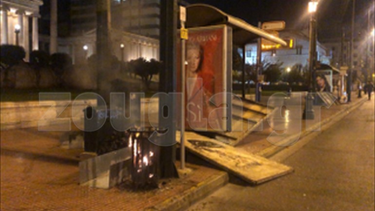 Λίγο μετά τις 19.00, άγνωστοι έβαλαν φωτιά σε κάδο απορριμμάτων στην πλατεία Εξαρχείων. Eπίσης επί της Πανεπιστημίου οι διαδηλωτές προκάλεσαν ζημιές σε στάσεις. Αργότερα λίγο μετά τις 20.00 σημειώθηκε μικροένταση εντός της περιοχής των Εξαρχείων όταν άτομα προσπάθησαν να στήσουν οδοφράγματα στην οδό Χαριλάου Τρικούπη και να βάλουν φωτιές. Oι αστυνομικοί απάντησαν με χρήση χημικών.
