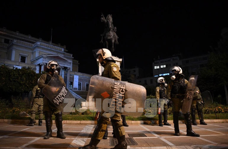 Οι δυνάμεις των ΜΑΤ είχαν μπει στην πλατεία των Εξαρχείων και το υδροβόλο όχημα «Αίας» της αστυνομίας προχώρησε και σε ρίψη νερού για να σβήσει κάποιες φωτιές.