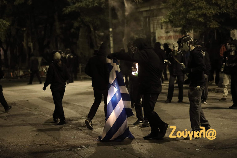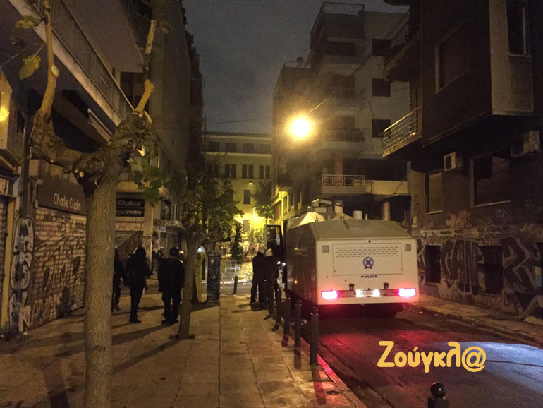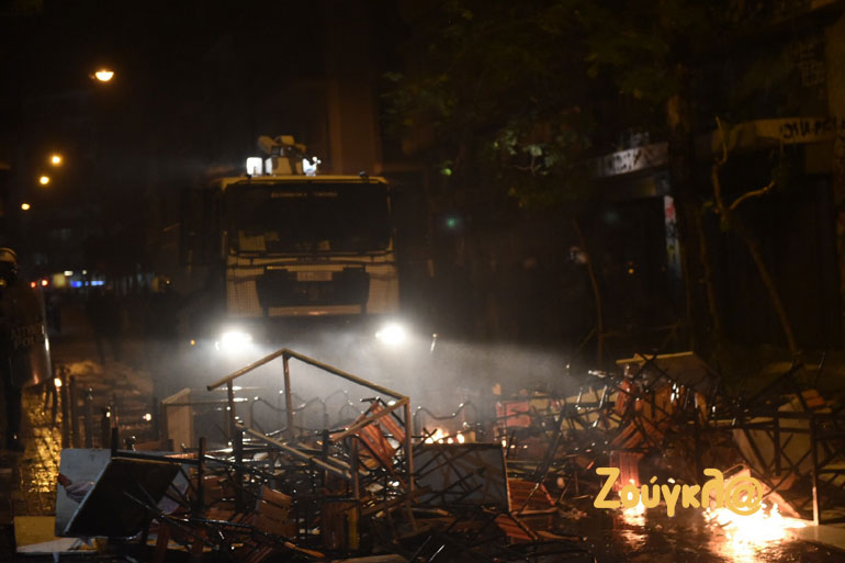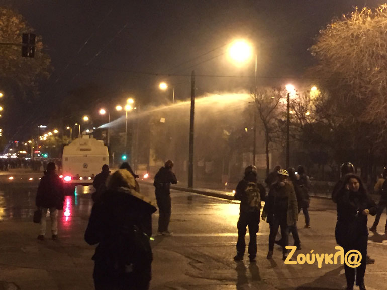 Ειδικό όχημα της ελληνικής αστυνομίας κάνει αυτή την ώρα ρίψεις νερού επί της οδού Πατησίων προς την πλευρά του Πολυτεχνείου όπου είναι συγκεντρωμένα αρκετά άτομα. Τα άτομα αυτά πετούν δεκάδες βόμβες μολότοφ, πέτρες και κομμάτια από μάρμαρα κατά των αστυνομικών δυνάμεων που από την πλευρά τους κάνουν ρίψεις χειροβομβίδων κρότου λάμψης καθώς και δακρυγόνων προκειμένου να απομακρύνουν τους ταραξίες.