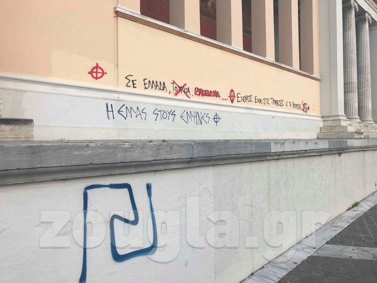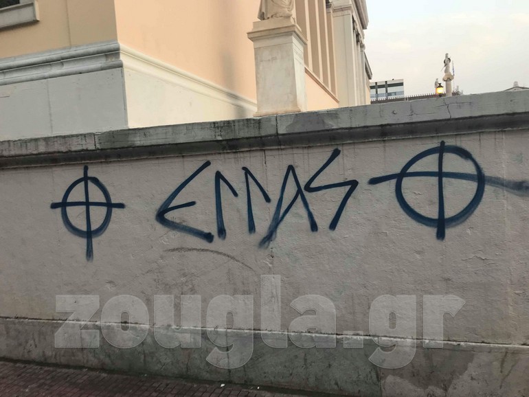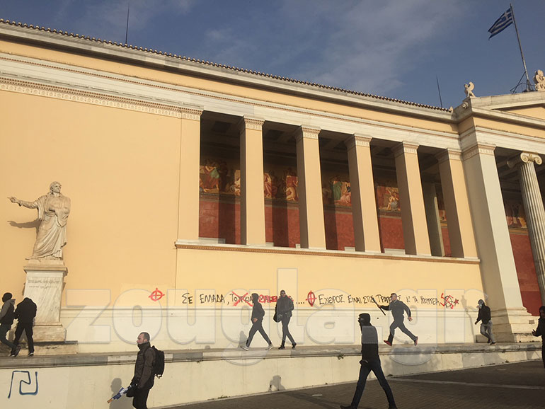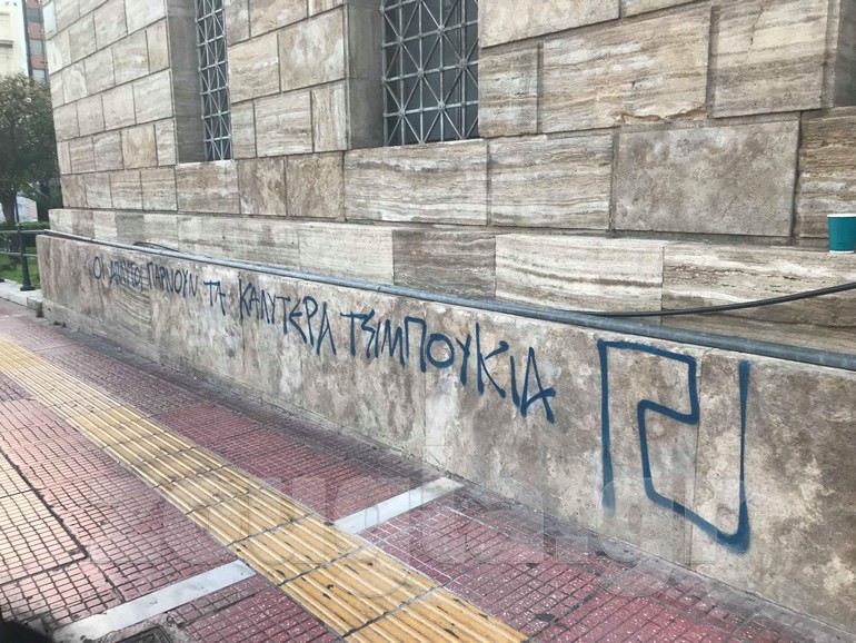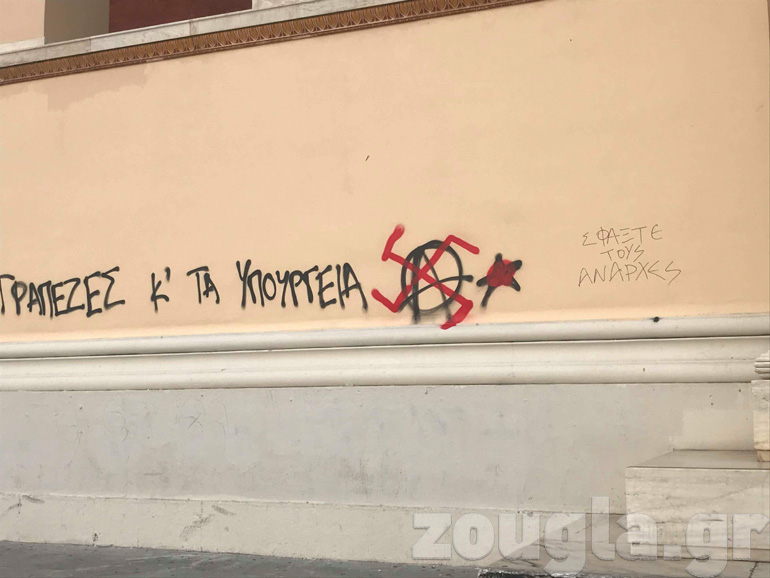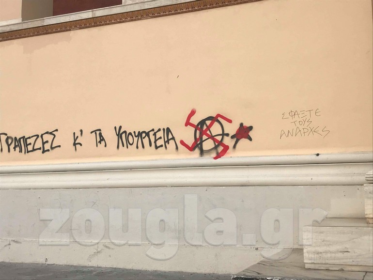 Οι διαδηλωτές που έφτασαν στα Προπύλαια και συγκρούστηκαν με τις αστυνομικές δυνάμεις, φεύγοντας, άφησαν το στίγμα τους μέσω συνθημάτων που έγραψαν στους τοίχους.