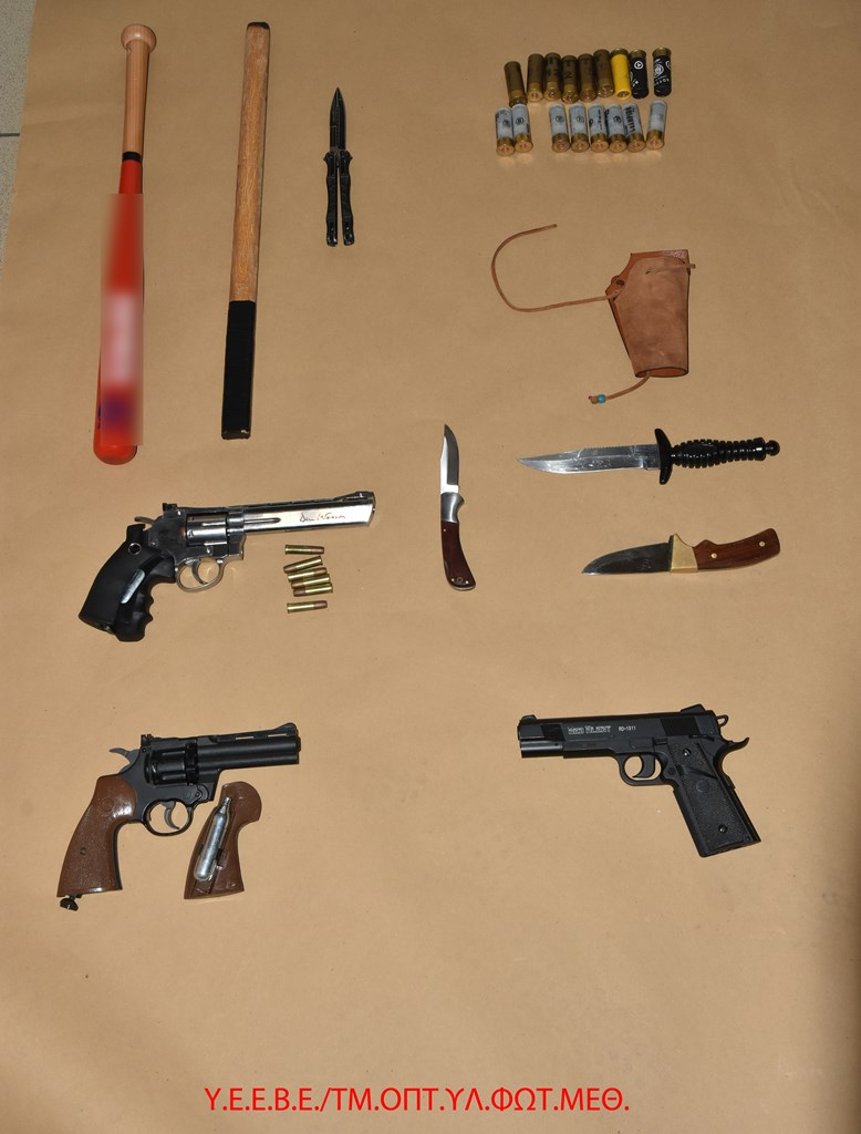 Επιπλέον, κατά την ίδια ανακοίνωση, συνελήφθη ένας 15χρονος μαθητής επειδή είχε αναρτήσει σε διαδικτυακή εφαρμογή φωτογραφίες με μαχαίρια και πιστόλια. Κατά την έρευνα που διενεργήθηκε στο σπίτι του κατασχέθηκαν δύο περίστροφα αερίου με έξι φυσίγγια, ένα μαχαίρι, ένας σουγιάς, μία θήκη όπλου, ένα κοντάρι κι ένα ρόπαλο του μπέιζμπολ. Εκτός από τον ανήλικο συνελήφθη κι ο 54χρονος πατέρας του, καθώς κατείχε μία κυνηγετική καραμπίνα και 17 φυσίγγια, χωρίς να κατέχει την απαιτούμενη άδεια.