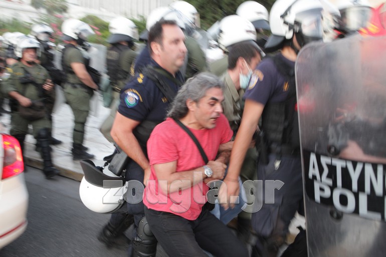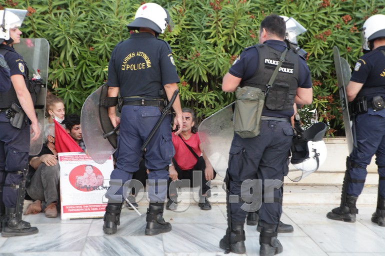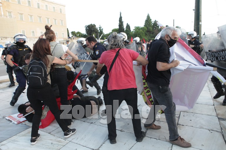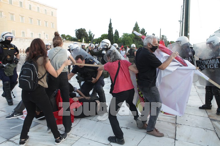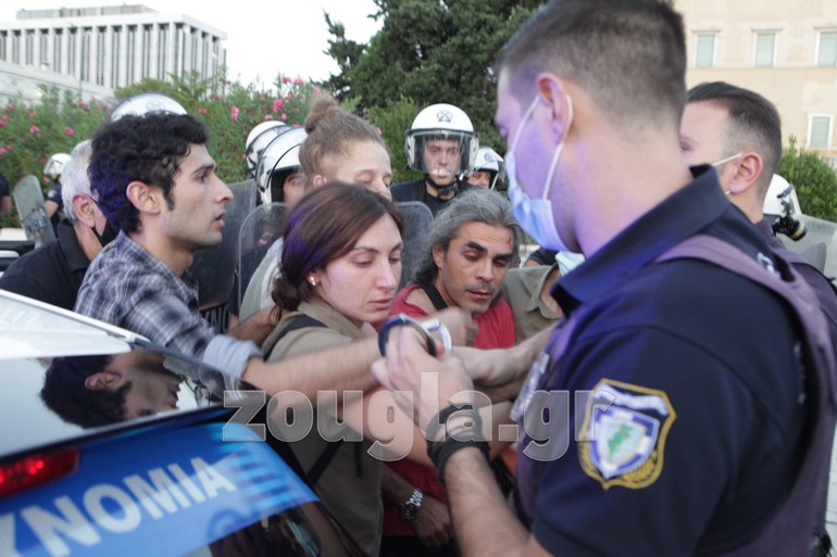 Σύμφωνα με πληροφορίες, οι διαδηλωτές βρέθηκαν περικυκλωμένοι από δυνάμεις των ΜΑΤ στο πεζοδρόμιο επί της Αμαλίας, έξω από τη Βουλή, ενώ η αστυνομία προχώρησε σε συλλήψεις.