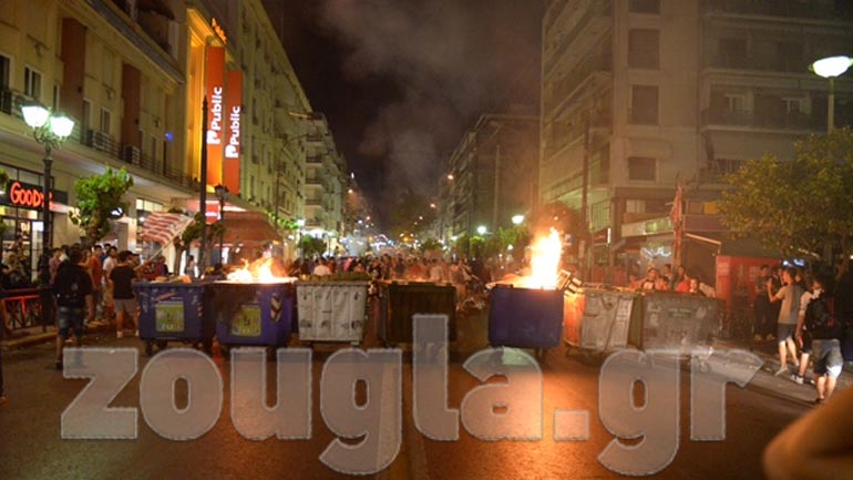 Φωτιές σε κάδους επί της οδού Γρηγορίου Λαμπράκη έβαλαν νεαροί μετά το τέλος του αγώνα μεταξύ του Ολυμπιακού και της Ρεάλ Μαδρίτης για το τρόπαιο της Euroleague.