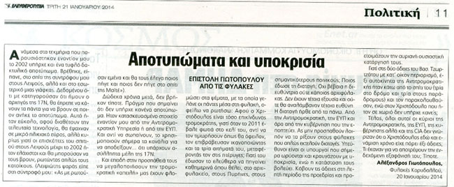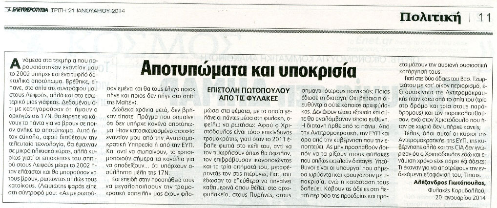 Μία επιστολή που φέρει το όνομα του καταδικασθέντος για συμμετοχή στην οργάνωση «17Ν» Αλέξανδρου Γιωτόπουλου δημοσιεύει σήμερα η «Ελευθεροτυπία».