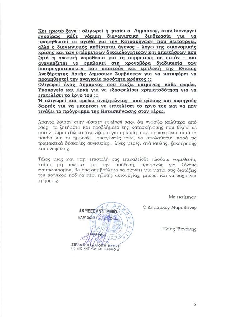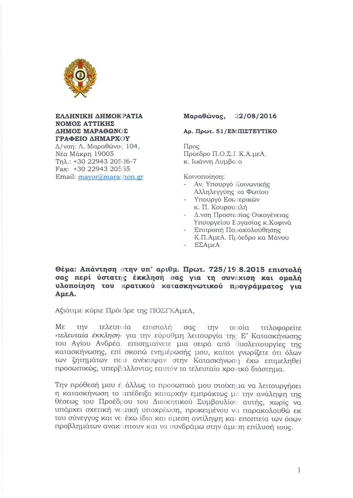 Επιστολή – απάντηση απέστειλε ο Δήμαρχος Μαραθώνος, Ηλίας Ψηνάκης, προς τον Πρόεδρο ΠΟΣΓΚΑμεΑ, Ιωάννη Λυμβαίο,  σχετικά με την Ε’ Κατασκήνωση Αγ. Ανδρέα.