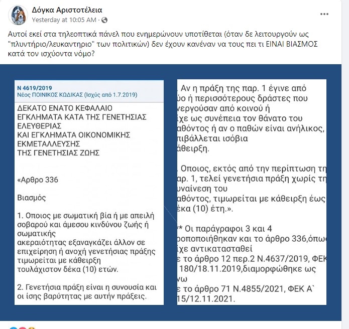 «Αυτοί εκεί στα τηλεοπτικά πάνελ, οι οποίοι υποτίθεται πως είναι εκεί για να ενημερώνουν (αν δεν λειτουργούν ως “μηχανισμός πλυντηρίου” πολιτικών), δεν έχουν απέναντί τους κανέναν να τους πει ότι Ο ΒΙΑΣΜΟΣ είναι αυτό που περιγράφει ο ισχύων νόμος;».