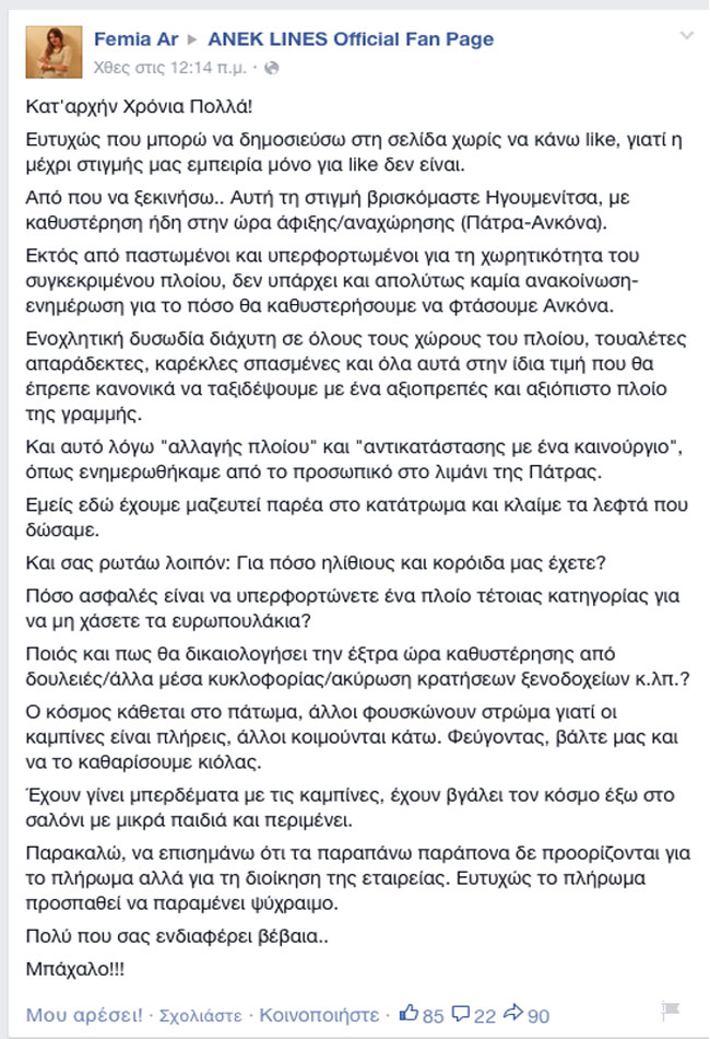Μια επιβάτιδα του Norman Atlantic, που επιβιβάστηκε στο λιμάνι της Πάτρας, πρόλαβε να γράψει μια ανάρτηση στον λογαριασμό της ΑΝΕΚ Lines στο facebook παραθέτοντας τα προβλήματα που αντιμετώπιζαν οι επιβάτες, πριν πιάσει φωτιά το πλοίο.