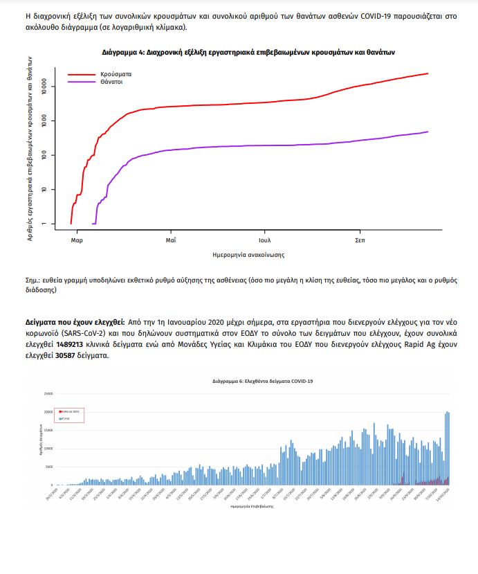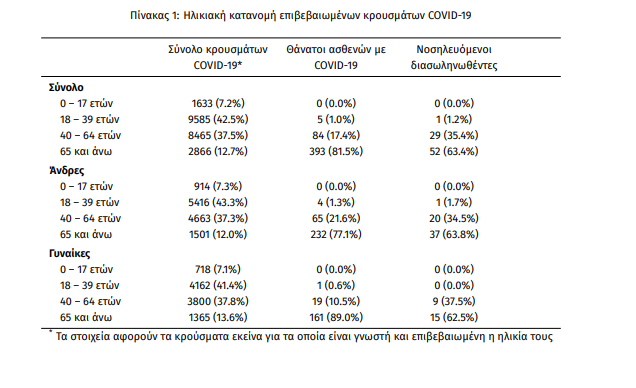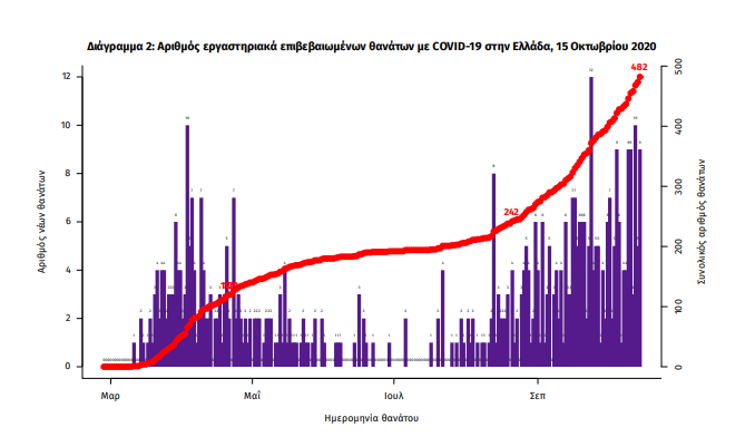 Τέλος, έχουμε 13 ακόμα καταγεγραμμένους θανάτους και 482 θανάτους συνολικά στη χώρα. 181 (37.6%) γυναίκες και οι υπόλοιποι άνδρες. Η διάμεση ηλικία των θανόντων συμπολιτών μας ήταν τα 79 έτη και το 96.3% είχε κάποιο υποκείμενο νόσημα ή/και ηλικία 70 ετών και άνω.
